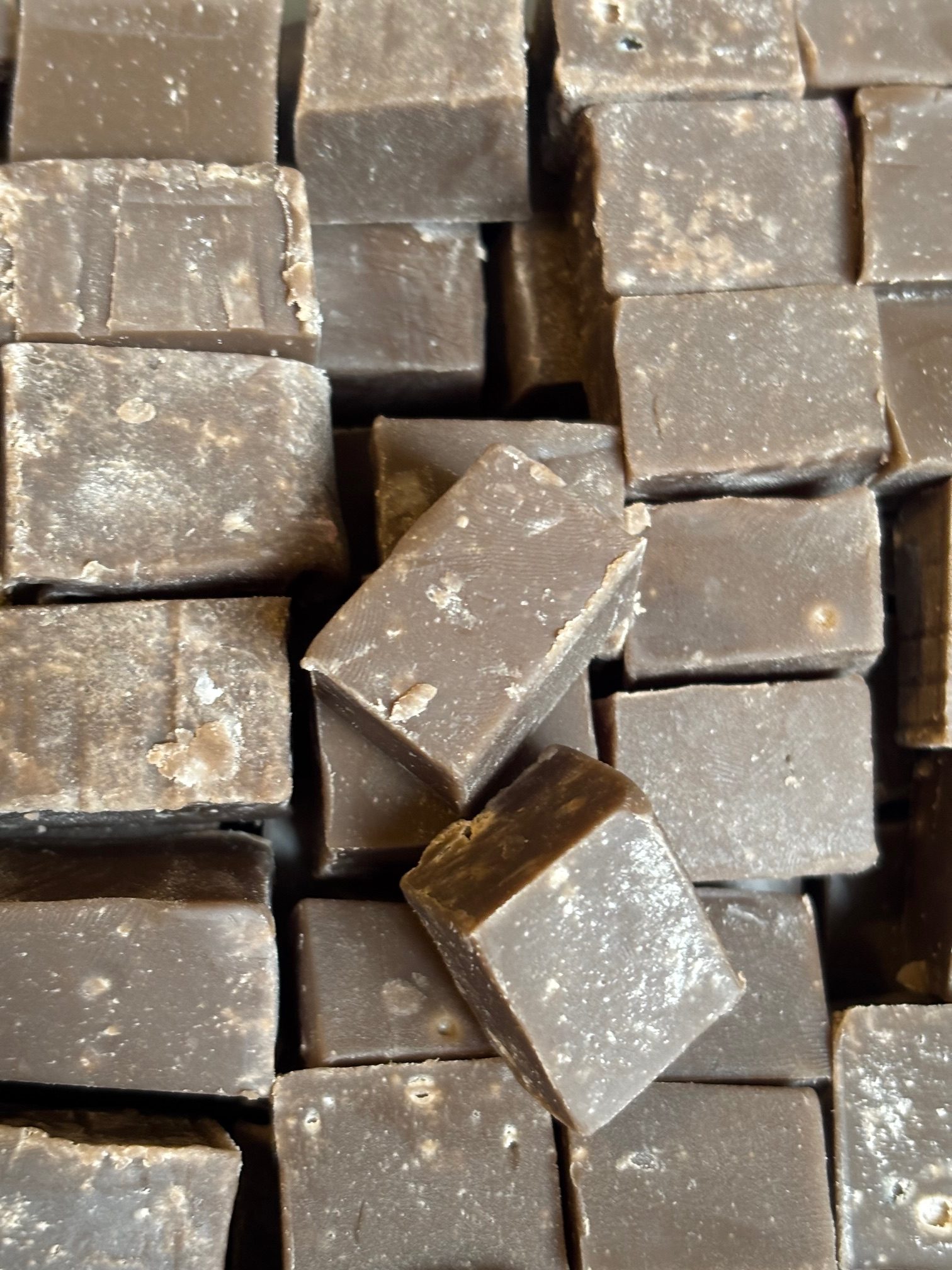 Sucre, lait concentré sucré , huile de palme hydrogénée, huile de stéarine de palme), fondant (sucre, sirop de glucose, eau) , sel, émulsifiant : lécithine de soja, colorant: E133, vert brillant, E102, brun chocolat, arômes.