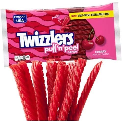 Les Twizzlers sont composés de filaments torsadés conçus pour être démêlés. Des bonbons à la cerise irrésistibles avec une texture réglisse ! typiquement américain…